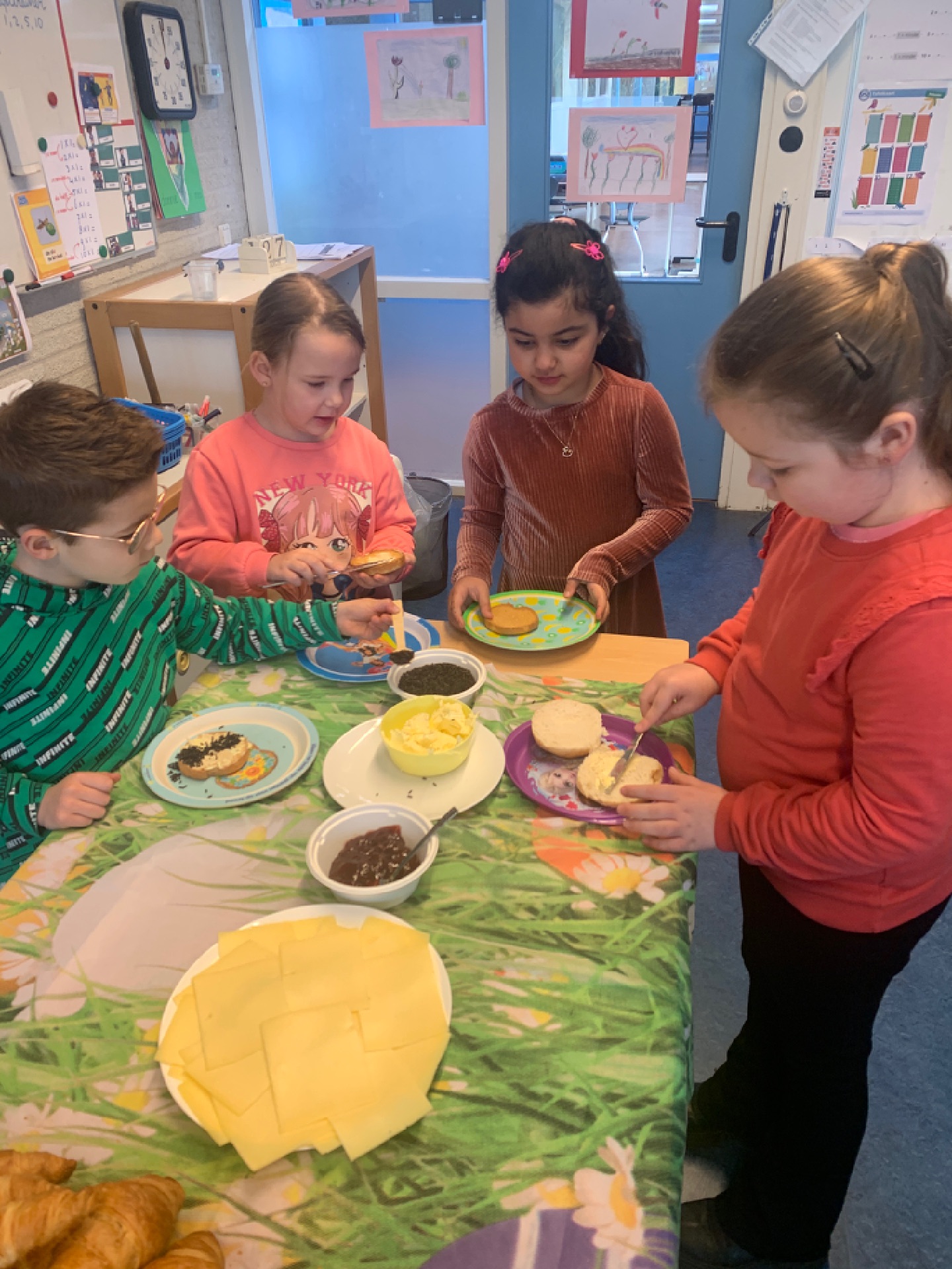 Vandaag zijn we verwend met een heerlijk paasontbijt. We hebben een leuk paasmandje geknutseld en paaseieren gezocht.