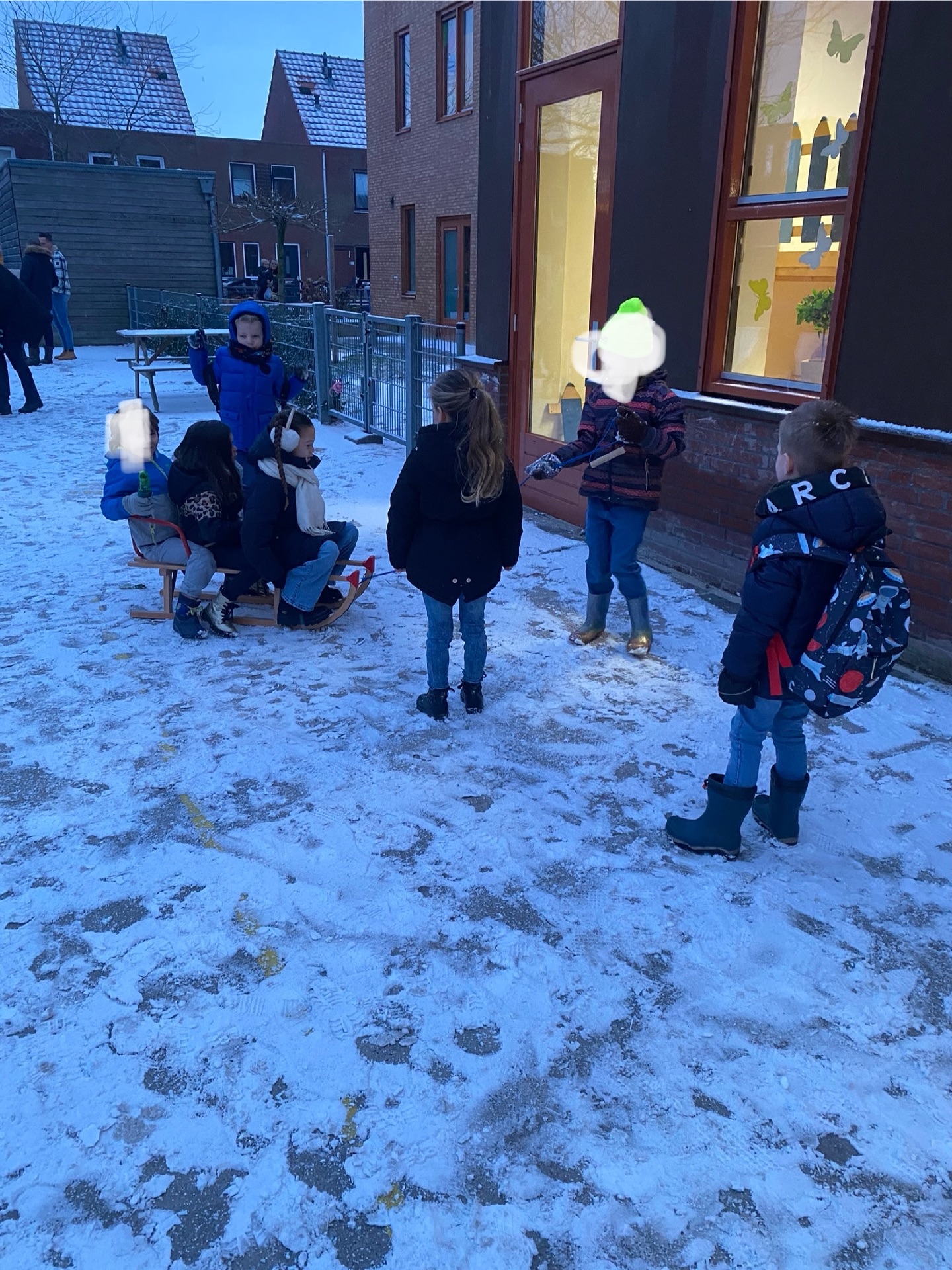 Vanochtend lag het hele schoolplein bedekt met een laagje sneeuw. Om hier van te kunnen genieten, hebben we samen met de kinderen uit groep 3/4 het eerste kwartier op het plein