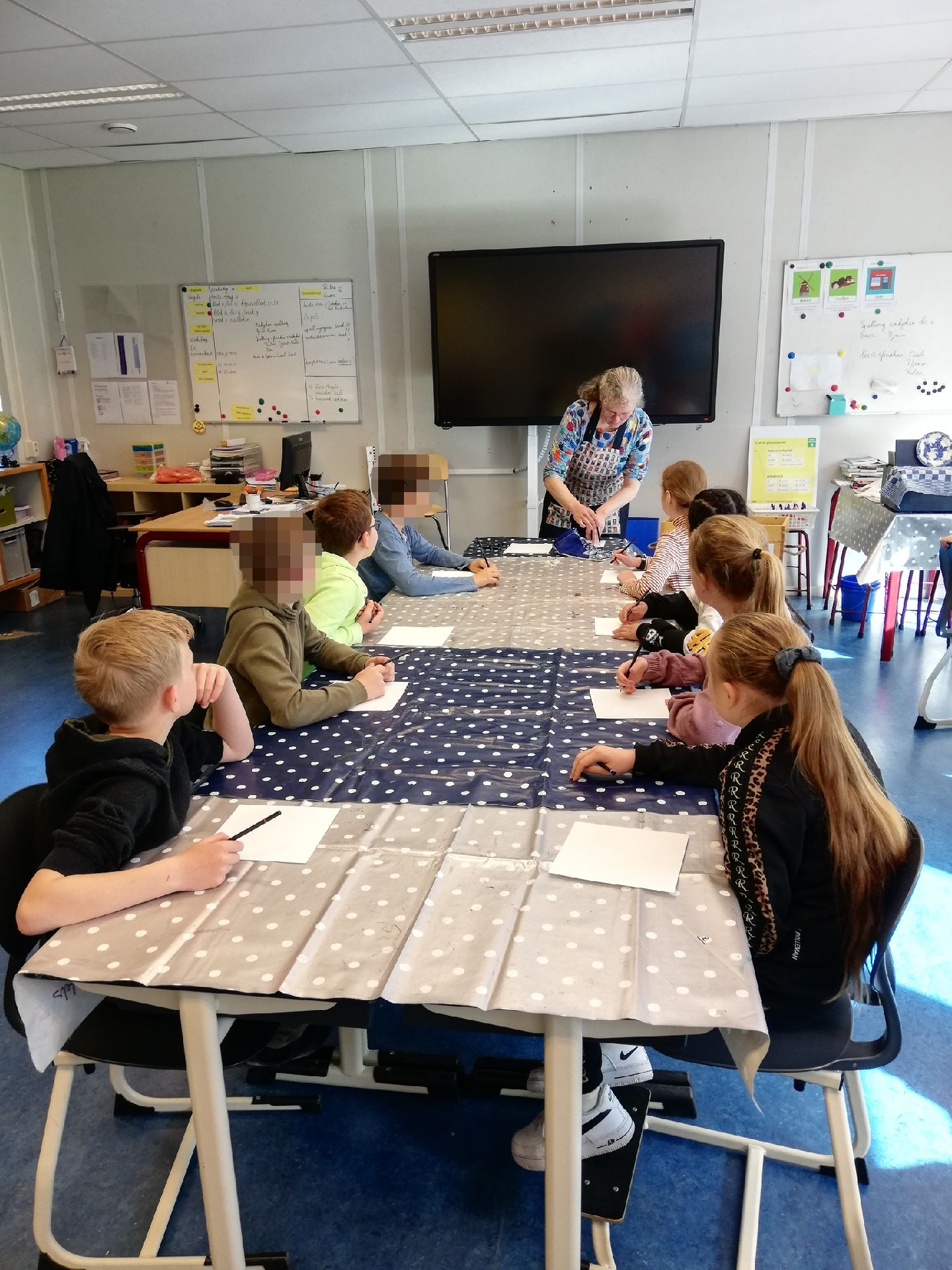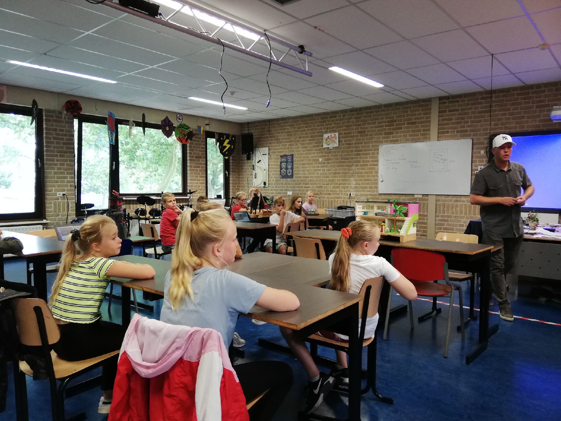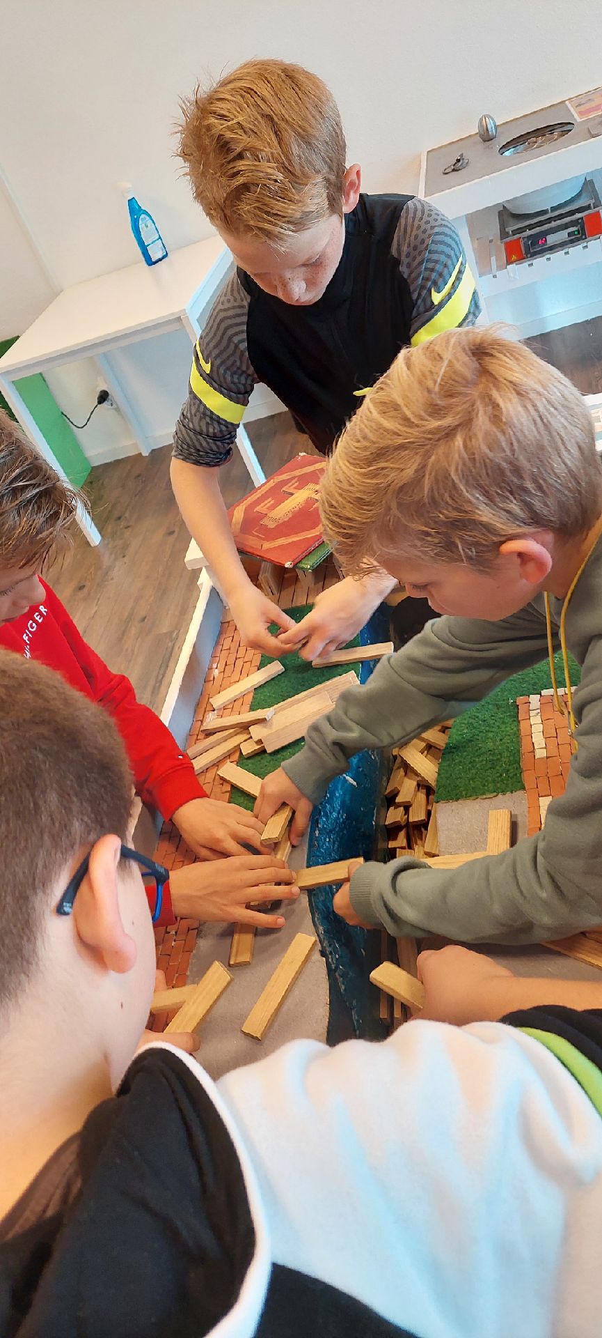 Er kwamen 2 vrouwen met hele grote dozen waar blokken in zaten onze hele klas werd in  2 groepen