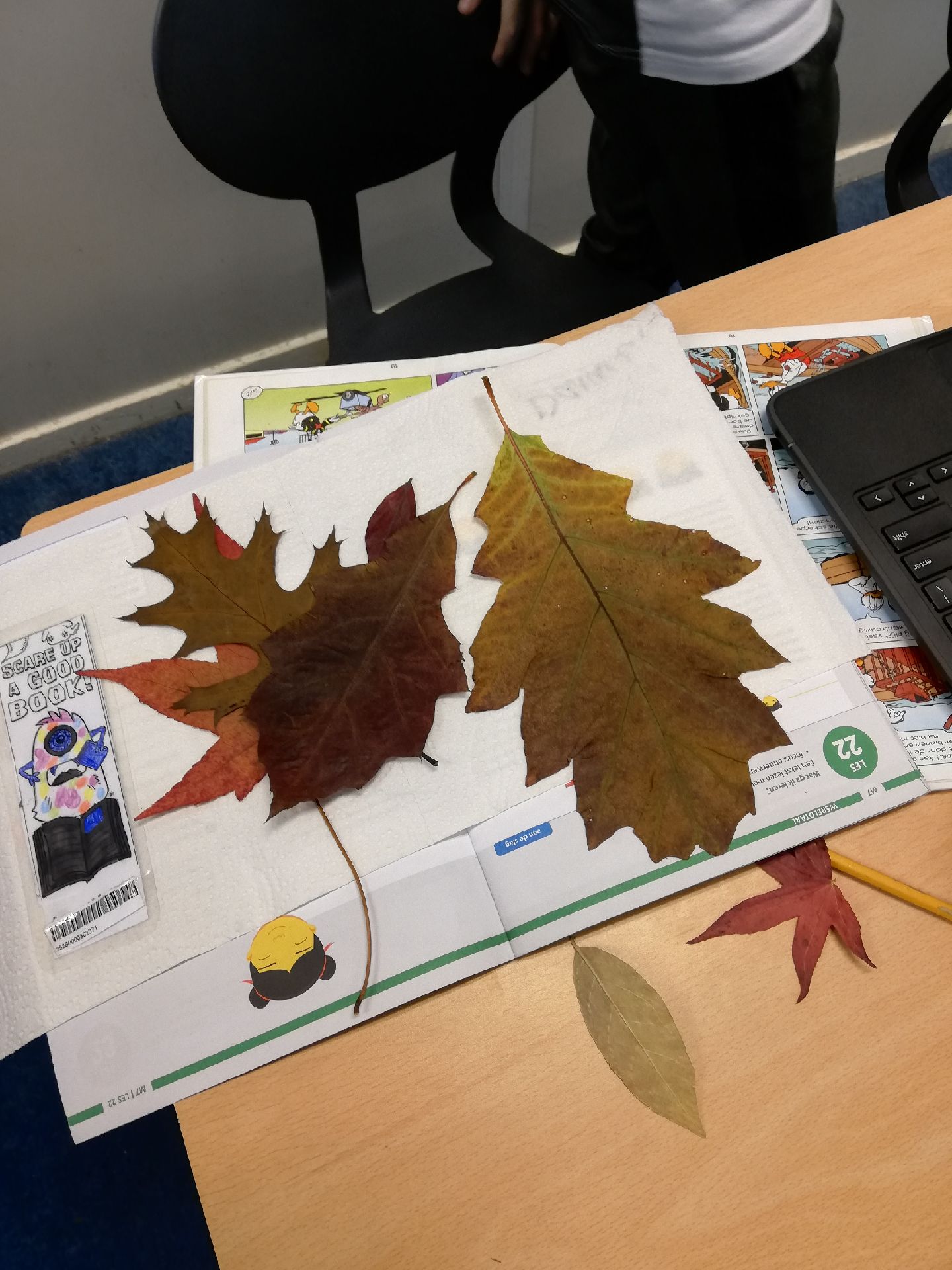 Bladeren zoeken en laten drogen in een dik boek. Vervolgens de bladeren determineren: adhv een aantal vragen uitzoeken van welke boom het blad komt.
