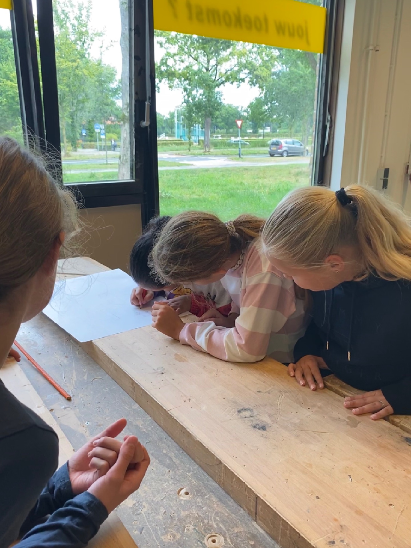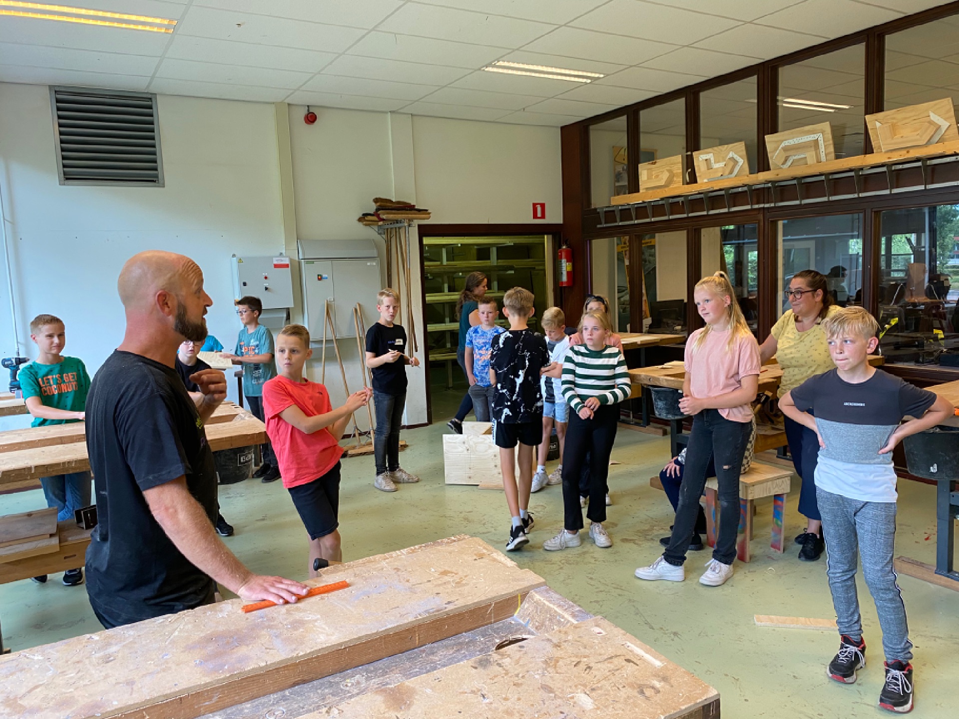 Onze groep 8B was op techniek. Bij de middelbare school Harm Smeenge. We gingen werken met hout. De docent deelde ons in groepjes van vier op. We moesten een stoel of een kruk
